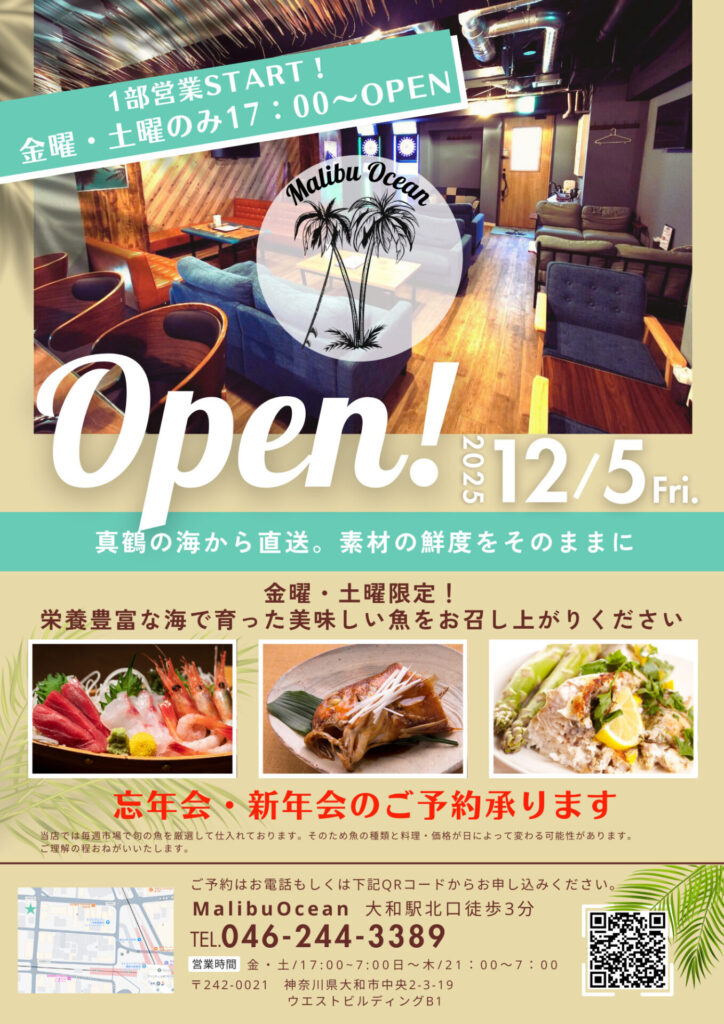 マリブオーシャンの1部営業がオープンいたしました☆金・土は17時からオープン!漁港から直接届いた新鮮なお魚料理をご提供★ぜひこの機会にお立ち寄りください♪マリブオーシャンでは忘年会・新年会のご予約をまだまだ受け付けております♪ご連絡をお待ちしております★